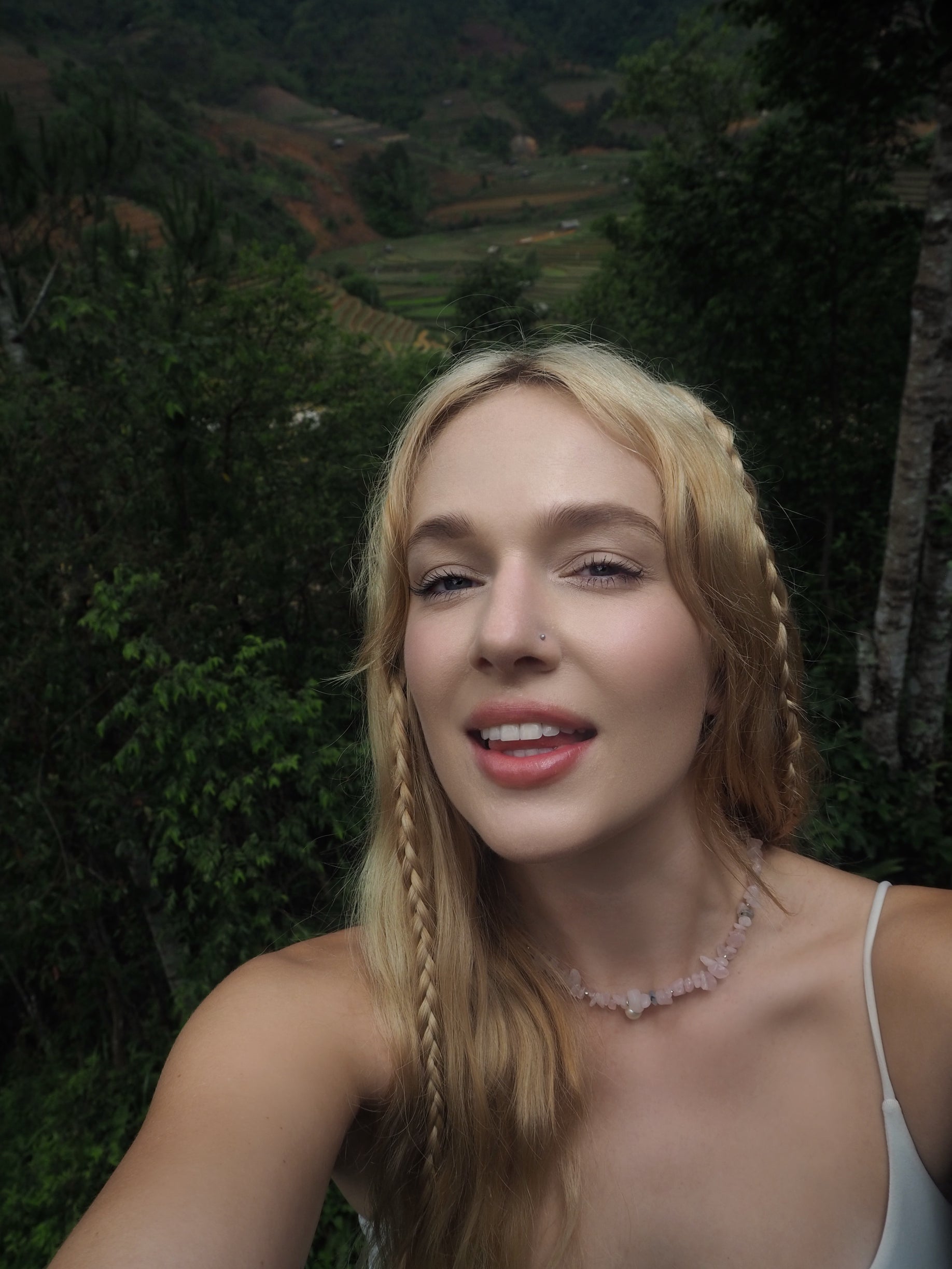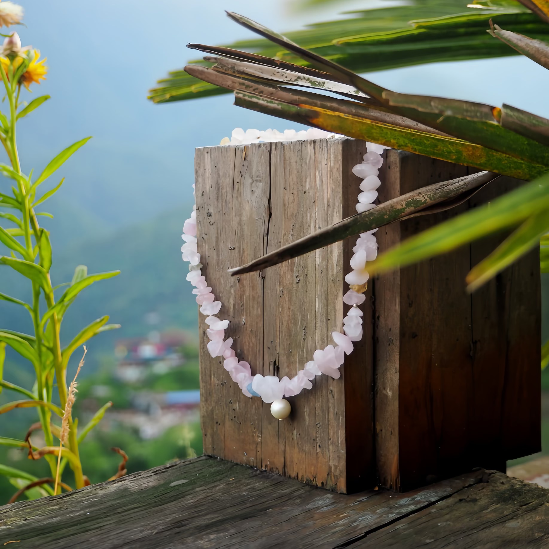 This handmade necklace combines soft rose quartz with a centered pearl and subtle accents of aquamarine, citrine, labradorite, and 925 silver. Inspired by the layered beauty of Da Lat, it's built on a strong wire and finished with a sterling silver clasp. Made to last—and made to travel.